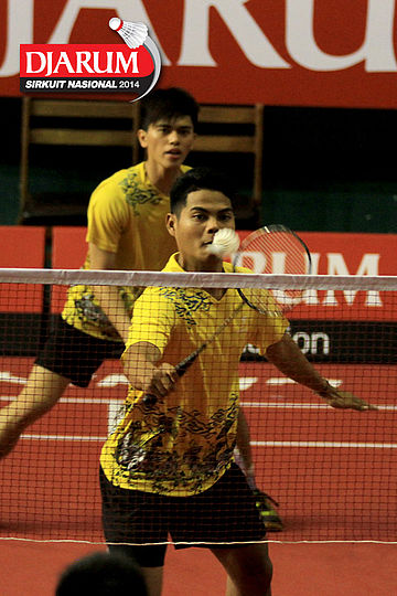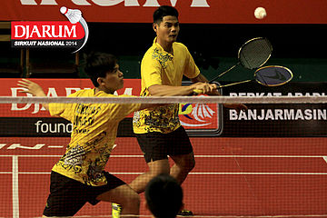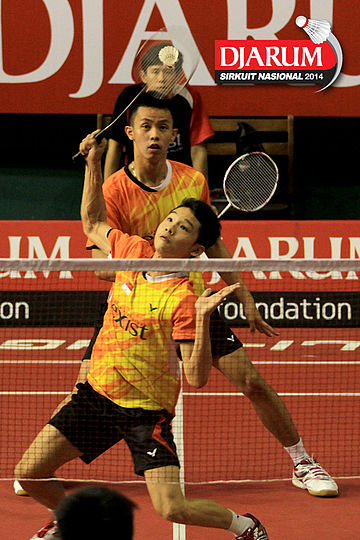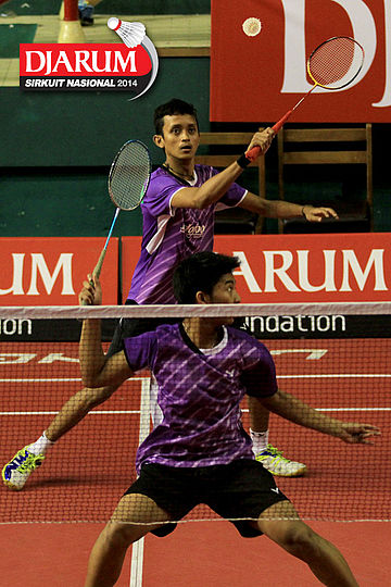 Ade Putra/Lutfi Azhar (Semen Gresik) menyambar pengembalian dari Albert Nugroho/Deny Mamahit (Exist)