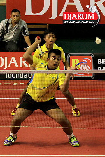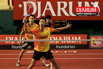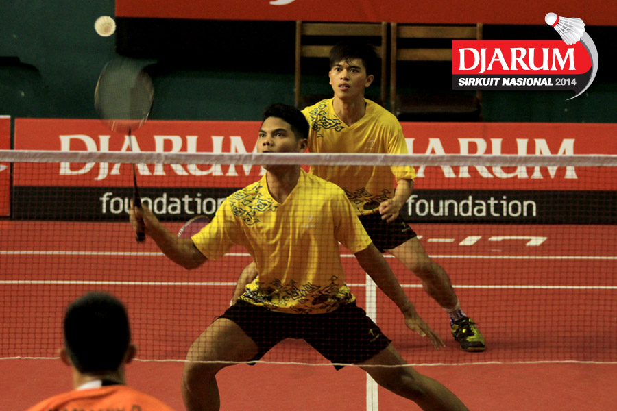Ade Putra/Lutfi Azhar (Semen Gresik) bersiap menyambut pengembalian dari Albert Nugroho/Deny Mamahit (Exist)