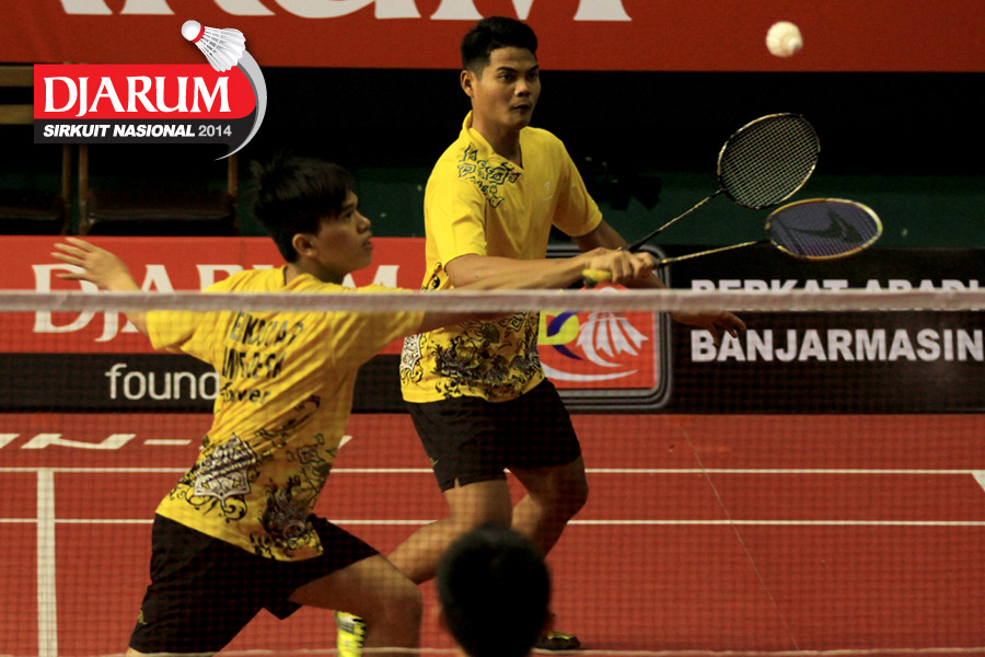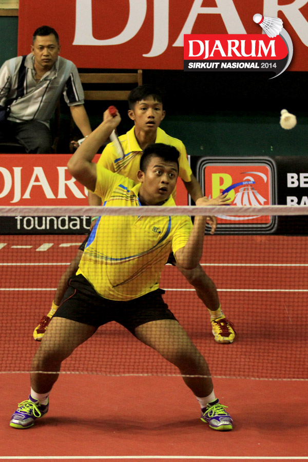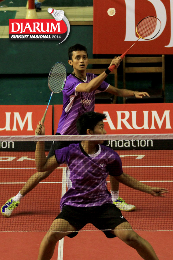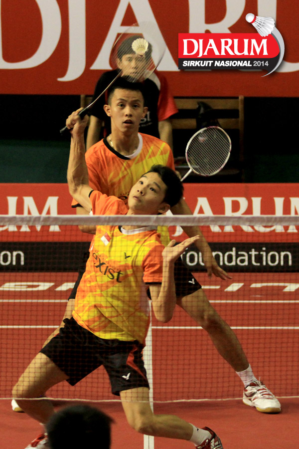 Ade Putra/Lutfi Azhar (Semen Gresik) mengembalikan shuttlecock ke arah Albert Nugroho/Deny Mamahit (Exist)