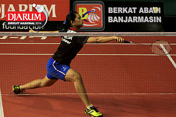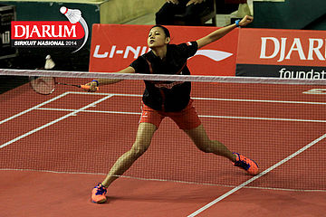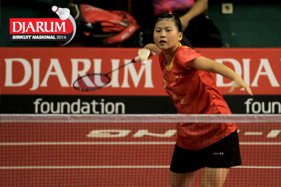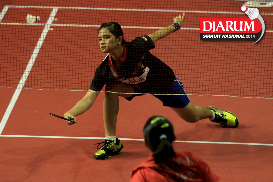 Devi Yunita (Djarum Kudus) mengembalikan shuttlecock ke arah Sandra Rahayu (Sarwendah)