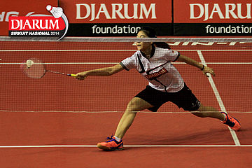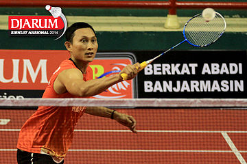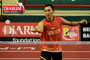 Sony Dwi Kuncoro (Tjakrindo Master) bersiap mengembalikan shuttlecock ke arah Erwin (Pempek Farhan)