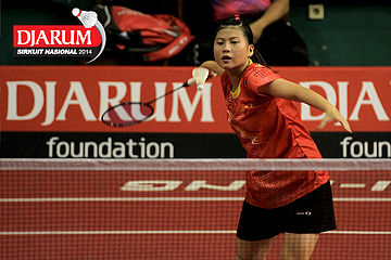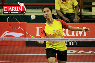 Ghaida Nurul (Djarum Kudus) mengembalikan shuttlecock ke arah Malikhatus Sholekah (Hi Qua Wima)