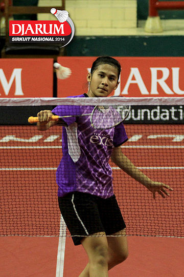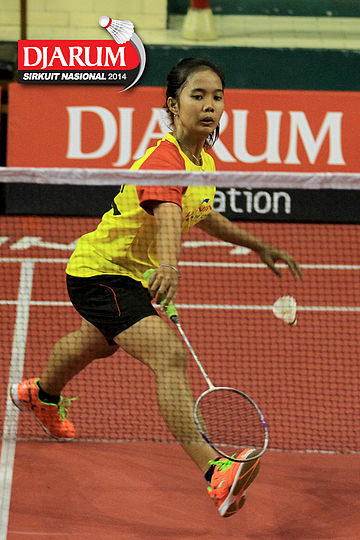 Marsa Indah (Djarum Kudus) mengembalikan shuttlecock ke arah Arieza Rizky (Victory Bogor)