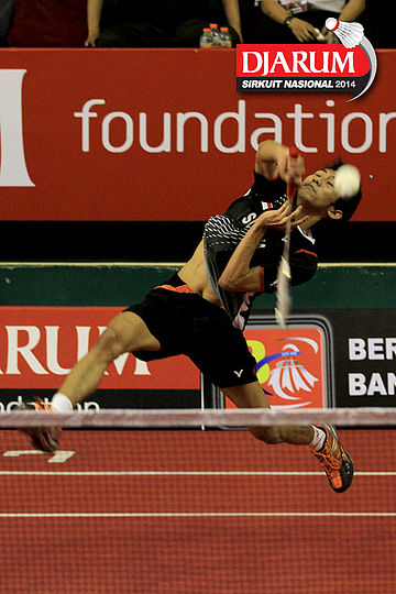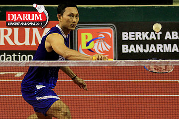 Sony Dwi Kuncoro (Tjakrindo Masters) bersiap mengembalikan shuttlecock ke arah Alvindo Saputra (Tangkas)