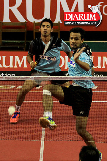 Hermansyah/Senatria Agus (Jaya Raya/SGS PLN) menyambar pengembalian tanggung dari Dicky Susilo/Rizky Kurniawan (Tjakrindo Masters/Doremi)