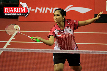 Ganis Nurrahmandani (Pertamina Fastron) mengembalikan shuttlecock ke arah Tike Arieda (Jaya Raya Suryanaga)