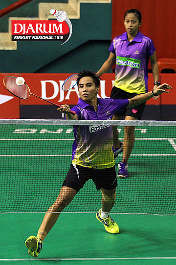 Franky Wijaya/Sabar Karyaman (Exist) mengembalikan shuttlecock