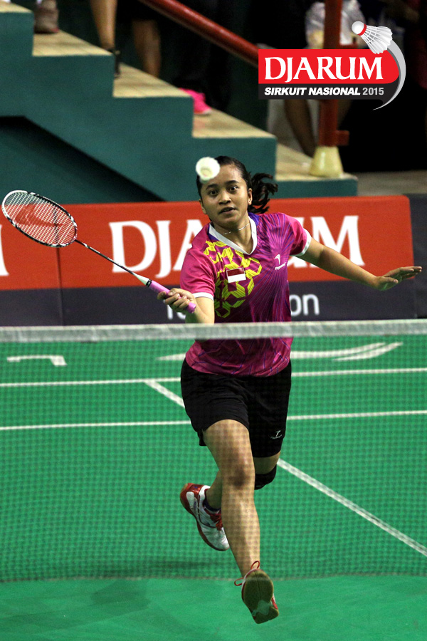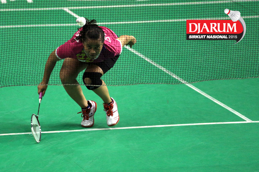 Hera Desi (Mutiara Cardinal) mengembalikan shuttlecock