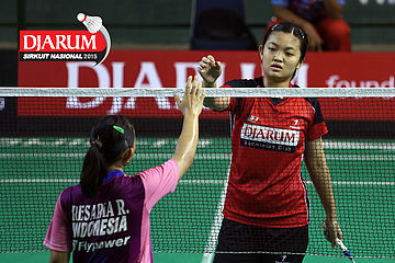 Savira Sandradewi (Djarum Kudus) bersalaman usai bertanding.