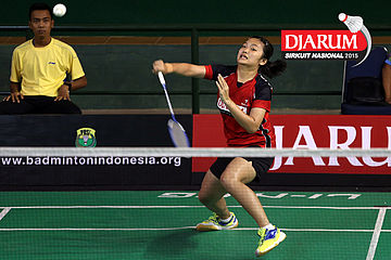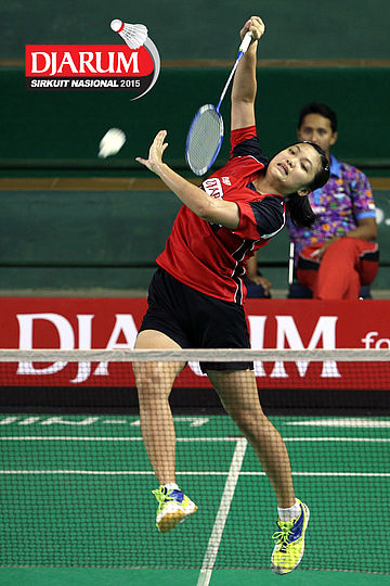Savira Sandradewi (Djarum Kudus) melepaskan serangan.