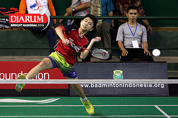 Alberto Alfin (Djarum Kudus) melepaskan smash.