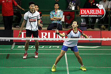 Ardy Nugroho/Lisa Ayu (Djarum Kudus) mengembalikan shuttlecock.