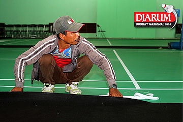 Salah satu pekerja saat memasang dekorasi Djarum Sirkuit Nasional 2014