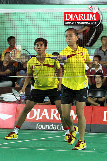 Rizal May/Tabita Christian (Hi Qua Wima) mengembalikan shuttlecock ke arah Deni Surya/Nabila (Semen Gresik)