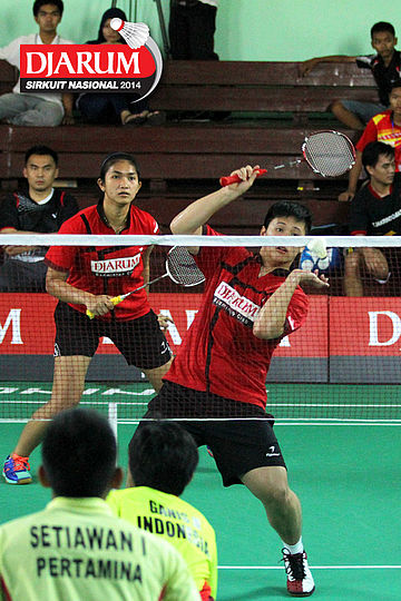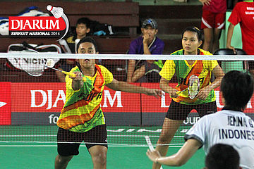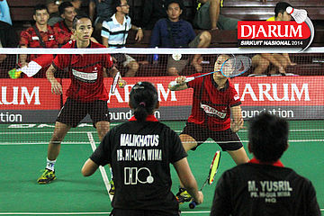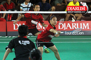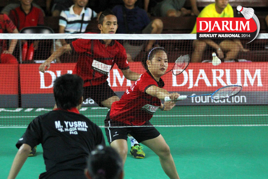 Hantoro/Deariska Putri (PB Djarum) menyambut serve dari Indra Setiawan/Ganis Nurrahmandani (Pertamina)