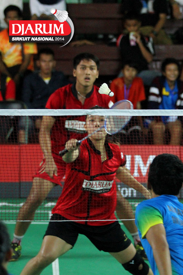 Arsya Isnanu/Nurbeta Kwanrico (PB Djarum) mengembalikan shuttlecock ke arah Rio Adiatma/Sessaria (Bintang Perkasa)