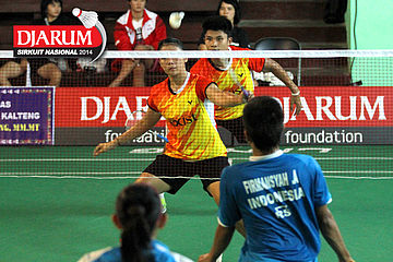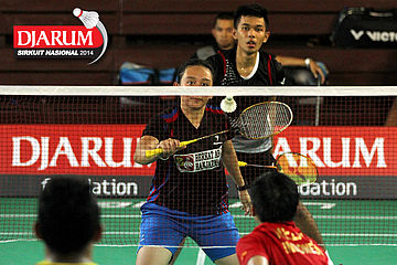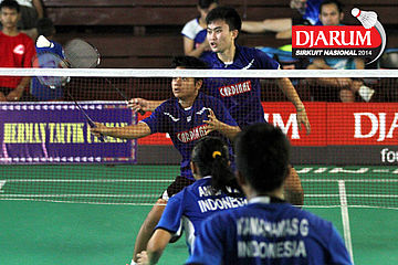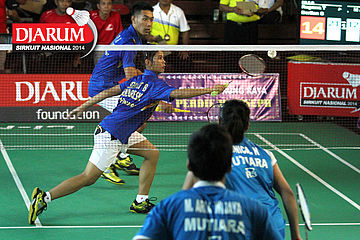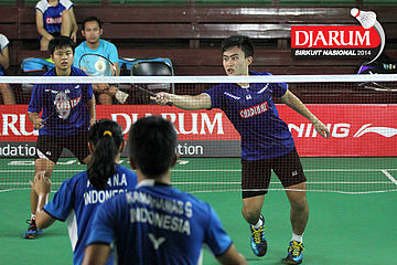Arsya Isnanu/Nurbeta Kwanrico (PB Djarum) mengembalikan shuttlecock ke arah Ardiansyah Putra/Devi Tika Permatasari (Berkat Abadi/SGS PLN)