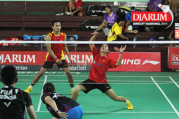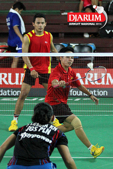 Arsya Isnanu/Nurbeta Kwanrico (PB Djarum) menyambar pengembalian dari Ardiansyah Putra/Devi Tika Permatasari (Berkat Abadi/SGS PLN)