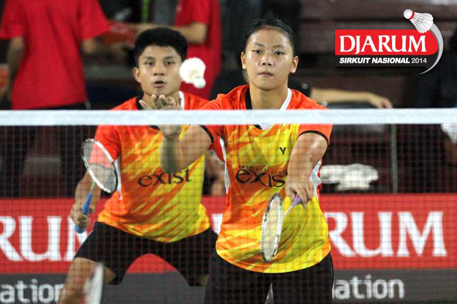 Giovani Dicky/Brigita Marcelia (Exist) melepaskan serve
