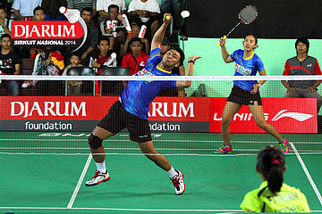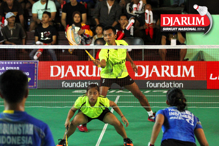 Anggun Nugroho/Dian Fitriani (Halim/Pertamina) mengembalikan shuttlecock ke arah Ardiansyah Putra/Devi Tika Permatasari (Berkat Abadi/SGS PLN)