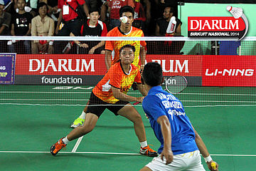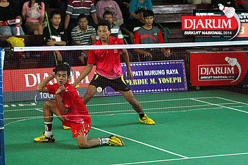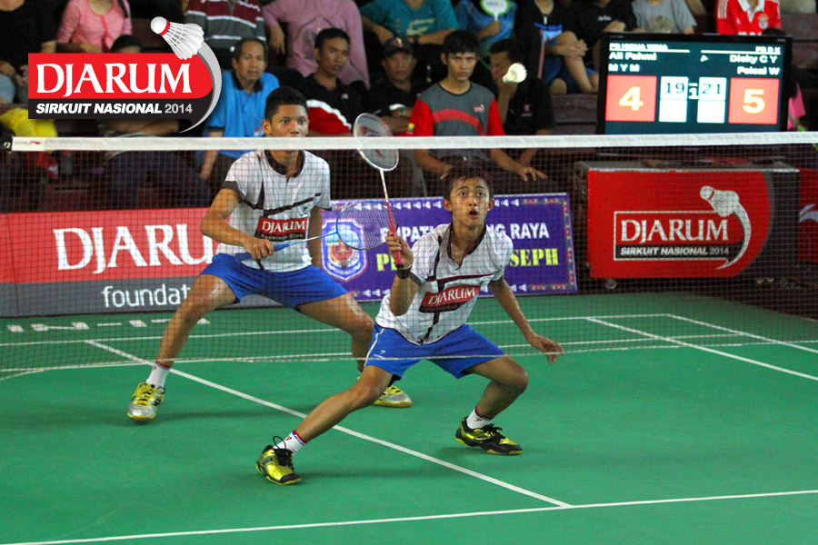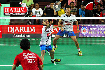 Dicky Cahya/Feisal Wiranto (PB Djarum) menyambar pengembalian tanggung dari Ali Fahmi/M. Yuzriel (Hi Qua Wima)