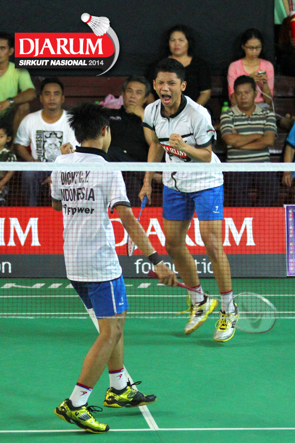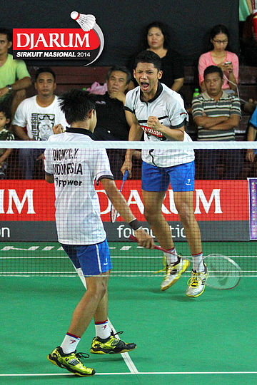 Ekspresi Dicky Cahya/Feisal Wiranto (PB Djarum) saat berhasil mencuri poin dari Ali Fahmi/M. Yuzriel (Hi Qua Wima)