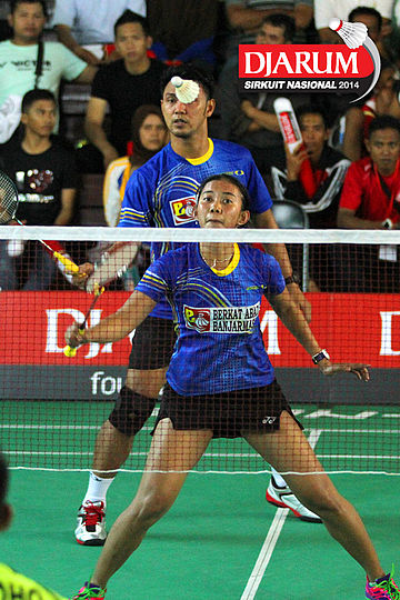 Ragawa Tamasuta/Berlian Sudrajat (Semen Gresik) berhasil menghadang pengembalian dari Gea Kamahamas/Anisa Nurazizah (Exist)
