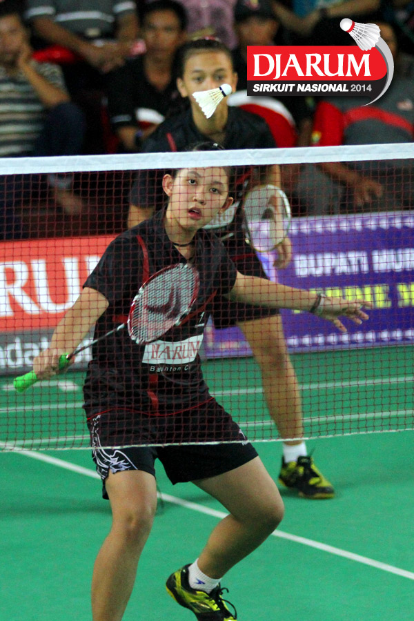 Febriana Dwipuji/Ribka Sugiarto (PB Djarum) mengembalikan shuttlecock ke arah Aldira Rizky/Rayhan Vania (Mentari V-Kool/Mutiara Bandung)