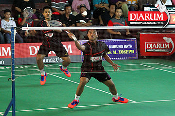 Hantoro/Kenas Adi (PB Djarum) berhasil menghadang serangan yang dilepaskan Rahmat Adianto/Seiko Wahyu (Tjakrindo Masters)