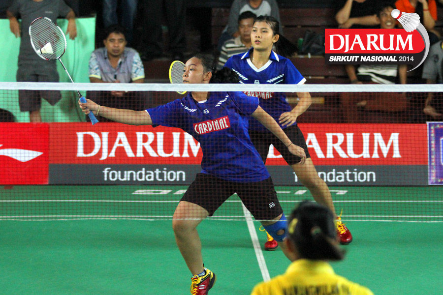 Dianita Saraswati/Yulfira Barkah (Mutiara Bandung) mengembalikan shuttlecock ke arah Fitria Ayu/Nabila (Semen Gresik)