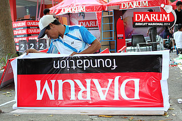 Sejumlah pekerja saat memasangkan giant banner Djarum Sirkuit Nasional 2014 di dalam GOR Bandar Baru, Batam.