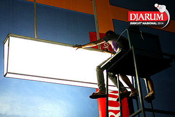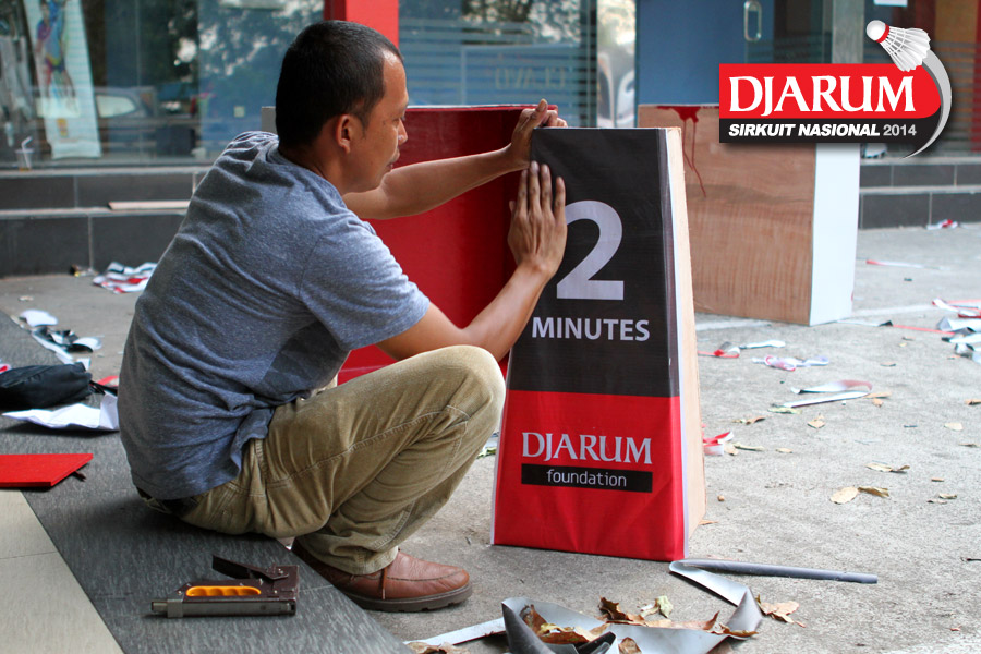 Seorang pekerja sedang memasang ads board Djarum Foundation.