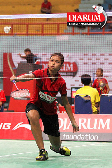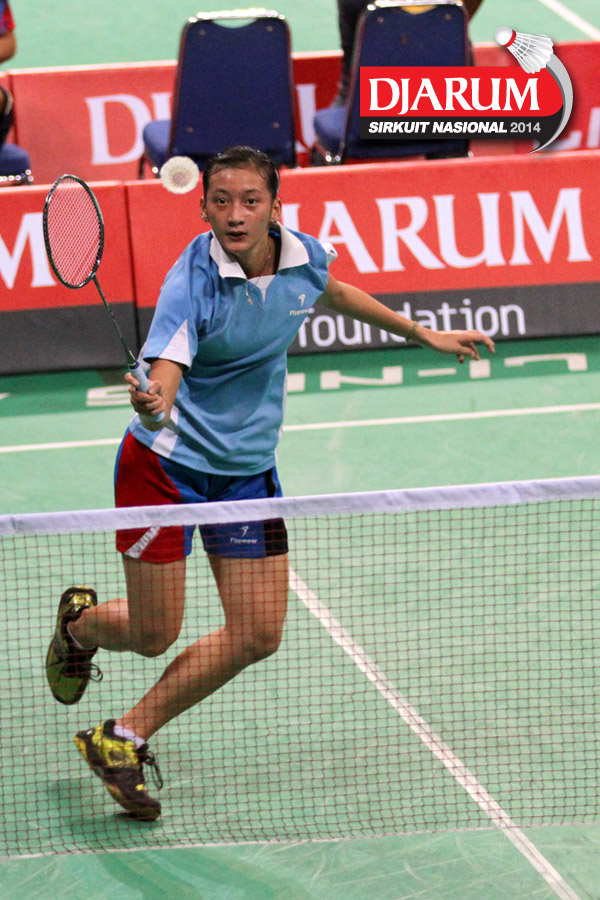 Mia Mawarti (Guna Dharma) bersiap menyambut pengembalian shuttlecock dari Syakila Syifa (Exist).