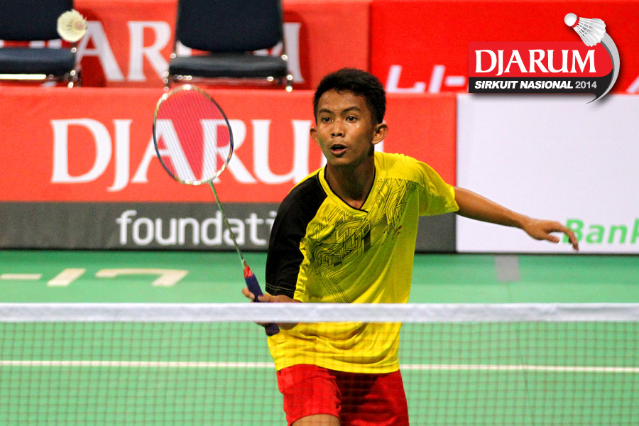 Hiski/Hasri (Jaya Raya Suryanaga) gagal menghadang smash keras yang dilepaskan pasangan ganda campuran remaja Mutiara Bandung, Selamet Nurcahyo/Jessica Wardana.