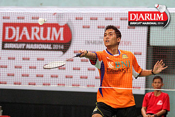 Nugroho Andi Saputro (JR Enkei) mengembalikan shuttlecock ke arah M. Junaedi (IPC).
