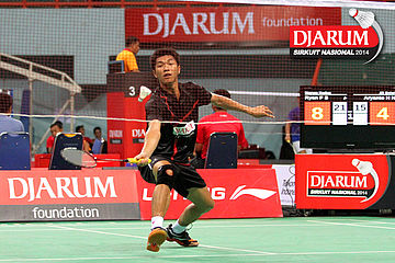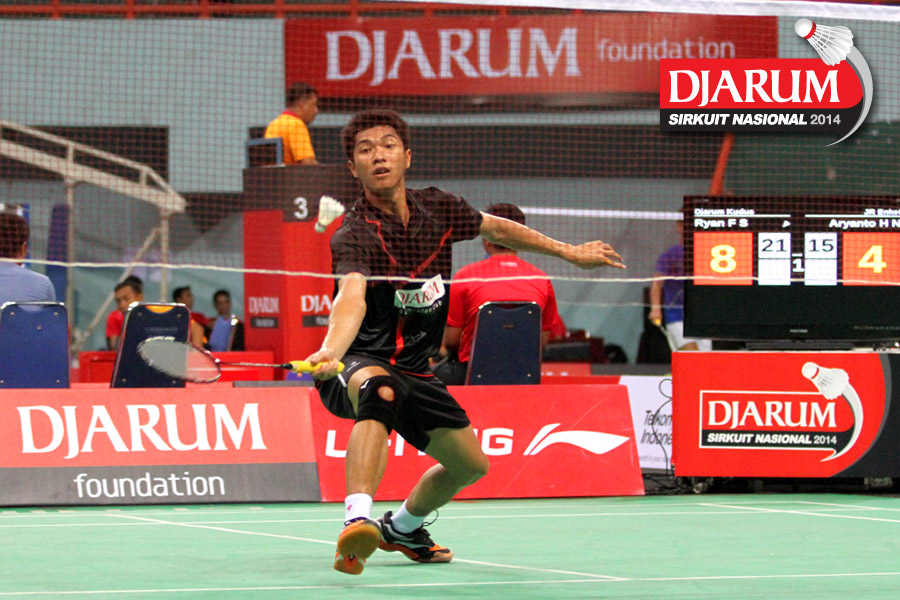 Ryan Fajar (PB Djarum) berusaha menggapai pengembalian dari Aryanto Haryadi (JR Enkei).