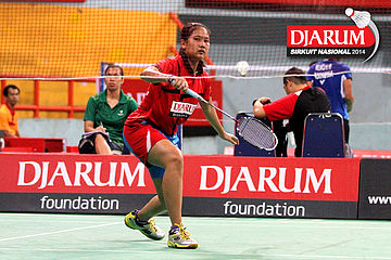 rinda Sari Sinaga (PB Djarum) mengembalikan shuttlecock ke arah Rena Suwarno (Jaya Raya).