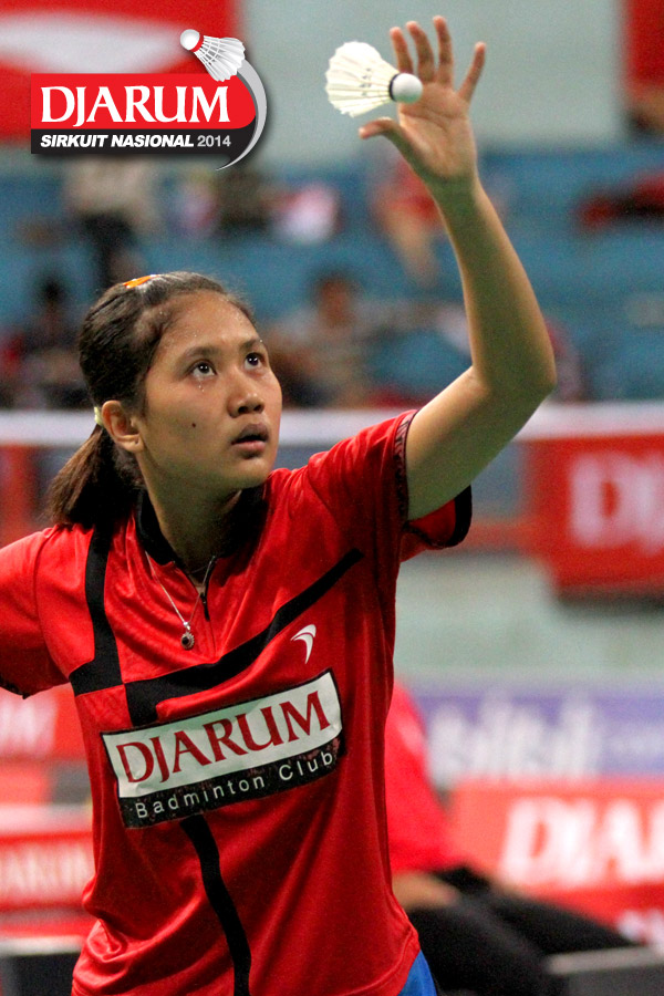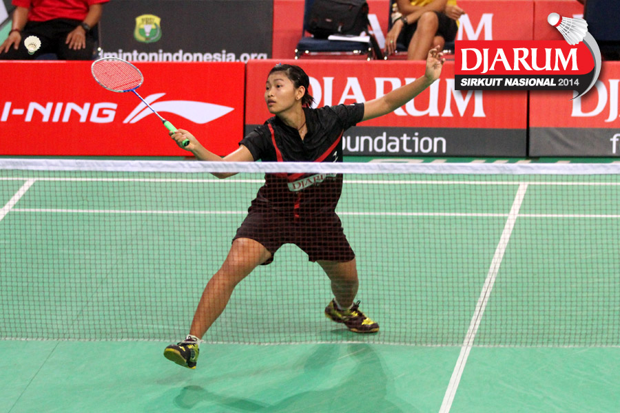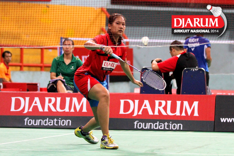 Rena Suwarno (Jaya Raya) mengembalikan shuttlecock ke arah Arinda Sari Sinaga (PB Djarum).