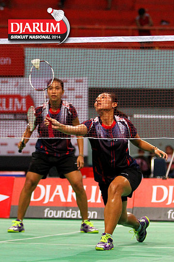 Dianita Saraswati/Yulfira Barkah (Mutiara Bandung) bersiap menyambar pengembalian dari Serena Kani/Vania Arianti (PB Djarum).