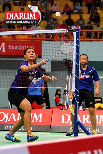 Aris Budiharti/Ery Octaviani (Jaya Raya) menyambut serve dari Dian Fitriani/Nadya Melati (Jaya Raya/Pertamina Indonesia).