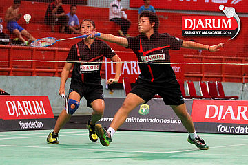 Afiat Yuris/Yohanes Rendy (PB Djarum) berhasil menghadang serangan yang dilepaskan pasangan Christopher Rusdiyanto/Tri Kusuma Wardhana (Jaya Raya Suryanaga).