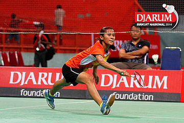 Priskila Siahaya (Exist) berusaha mengembalikan shuttlecock ke arah Linda Mutiara (Mutiara Bandung).