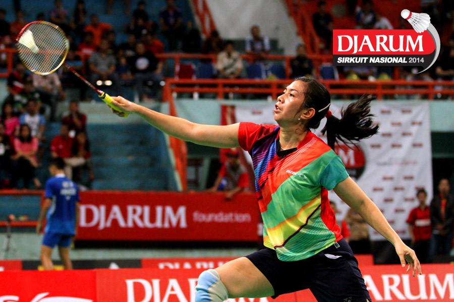 Adriyanti Firdasari (Jaya Raya) mengembalikan shuttlecock ke arah Tike Arieda (Jaya Raya Suryanaga).