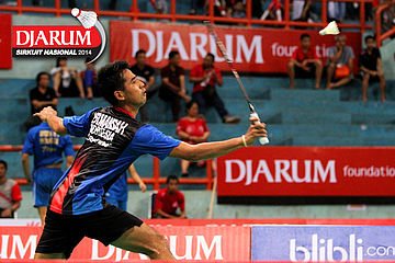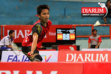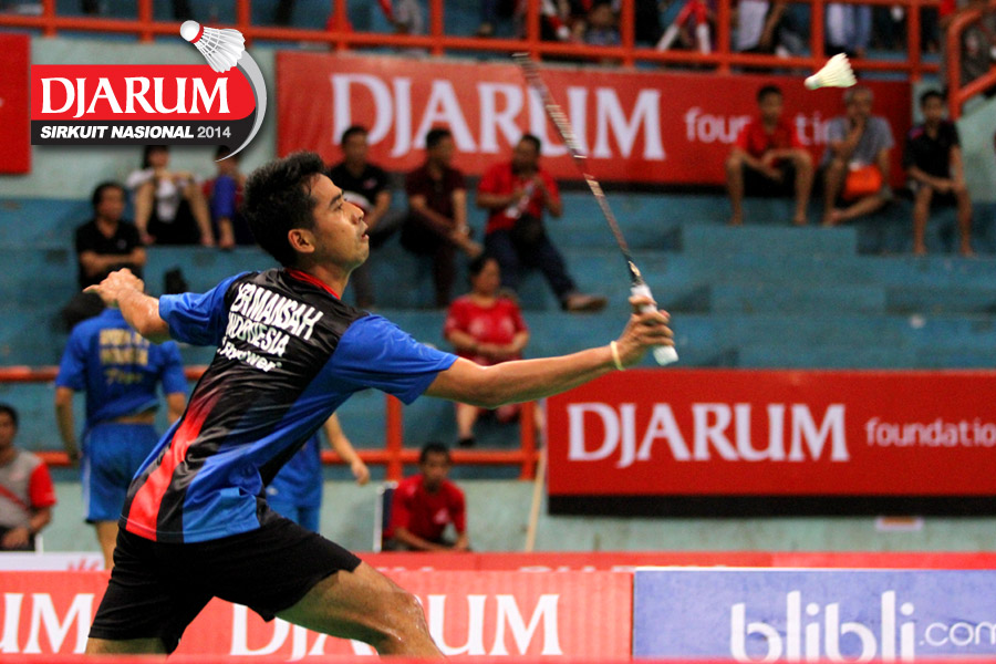 Vicky Angga Saputra (Tangkas) mengembalikan shuttlecock ke arah M. Shulton (Mutiara Bandung).