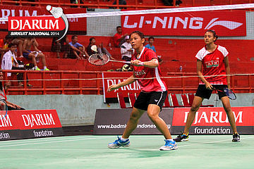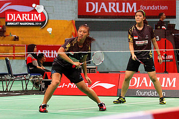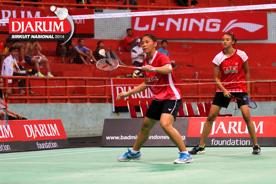 Serena Kani/Vania Arianti (PB Djarum) mengembalikan shuttlecock ke arah Dianita Saraswati/Yulfira Barkah (Mutiara Bandung).