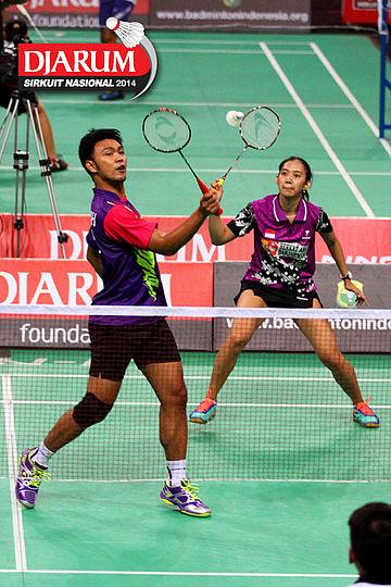 Arsya Isnanu/Meiliana Jauhari (PB Djarum) menyambut pengembalian dari Ardiansyah Putra/Devi Tika Permatasari (Berkah Abadi Banjarmasin/SGS PLN).