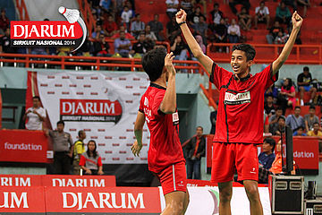 Selebrasi Akbar Gusti dan Ardi Nugroho (PB Djarum) setelah memenangkan pertandingan atas Ali Fahmi/Yuzriel Mahendra (Hi Qua Wima).