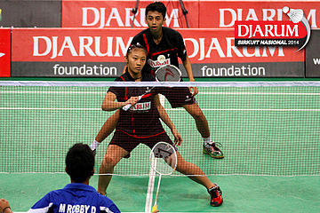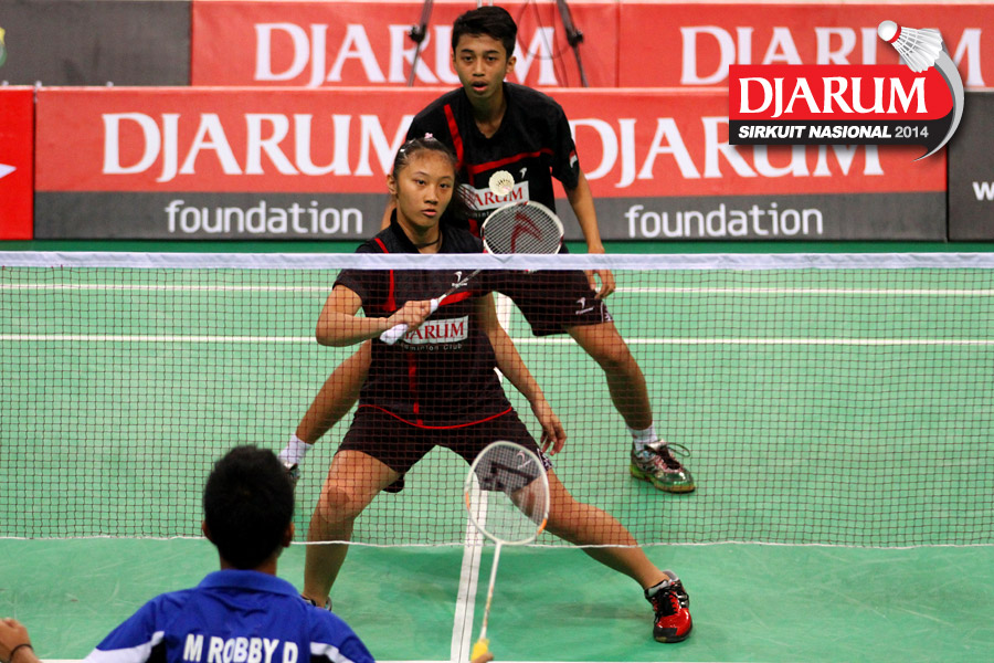 Akbar Gusti/Vania Arianti (PB Djarum) menyambut pengembalian dari pasangan M. Robi Darwis/Monika Insany (Mutiara Bandung).