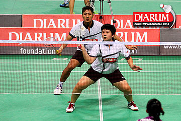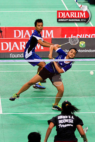 M. Robi Darwis/Monika Insany (Mutiara Bandung) menyambar pengembalian dari Akbar Gusti/Vania Arianti (PB Djarum).