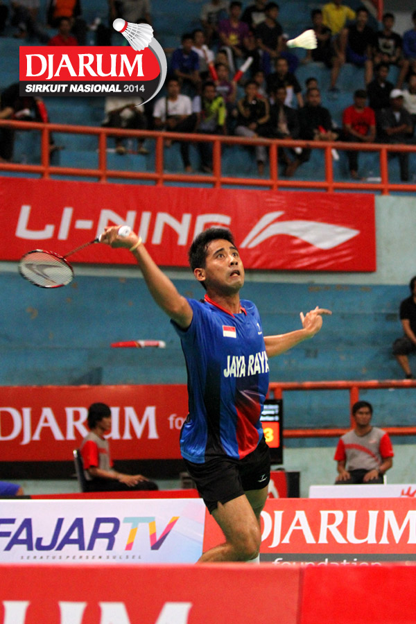 Hermansyah (Jaya Raya) bersiap melepaskan smash ke arah Febriyan Irvanaldi (Hi Qua Wima).